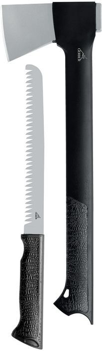Gator grip, glass filled nylon handle. Forged steel head/blade, ballistic nylon sheath. Holds diamond ground saw inside the axe handle (included). Overall length: 15.16". Wt: 26 oz.