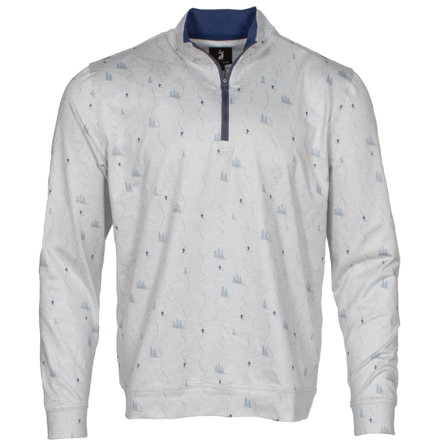 Immerse yourself in the thrill of skiing with our classic pattern adorning the Pow Turns Performance Tek Quarter Zip. The design captures the graceful motion of skiers navigating through fresh powder, celebrating your passion for skiing while maintaining a refined and understated appearance.