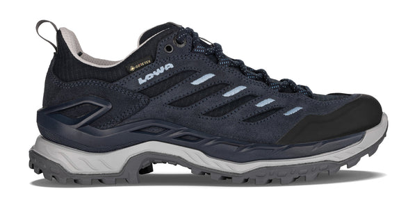 The dynamic INNOVO GTX LO Ws hiking shoe features a double-injected and comfortably cushioned LOWA® DYNAPU® midsole and a redesigned ‘chunky style’ outsole, which offers optimum grip thanks to the multidirectional lug design and the resulting larger contact surface. The hiking shoe breaks new ground in terms of comfort and benefits from a robust material mix of split leather and textile, a waterproof GORE-TEX membrane and numerous breathable surfaces. These features are complemented by a raised toe box and pull tabs for easier entry and exit. Thanks to its solid sole construction and the flexible yet robust upper, the INNOVO GTX LO Ws shines with a great mix of stability, support and dynamics.